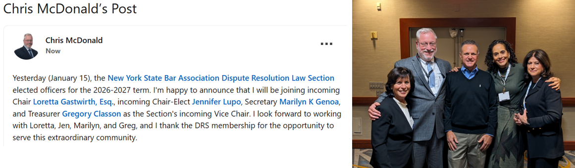 He is also an active member of multiple bar associations. Chris serves on the Advisory Council that oversees the Nassau County Bar Association’s ADR Program. He is a member of the New York City Bar Association’s ADR Committee and an affiliate member of its Arbitration Committee. Chris is also a member of several New York State Bar Association sections and committees, including the Commercial and Federal Litigation Section’s ADR Committee and the Dispute Resolution Section’s Domestic Arbitration, Securities Arbitration, and Mediation Committees, and he is co-chair of the Mediation Committee’s Professional Development Subcommittee.